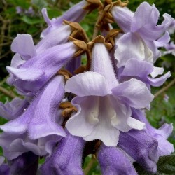Een bijzondere, Chinese boom, die behoorlijk winterhard is in ons land, zeker naarmate de boom ouder wordt. De teelt in een grote pot of metselkuip is voor kleinere tuinen een goede optie. Groot, hartvormig blad, aan de onderzijde behaard. De bloemtros is de beloning na een zachte winter: een opstaande tros met naar benedengerichte trompetbloemen, lichtviolet met gele strepen in de keel.