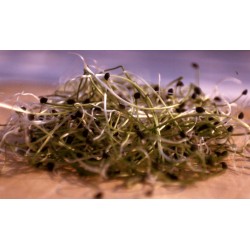 Deze zaden zijn na de oogst vrij bevonden van schadelijke bacteriën: Salmonella spp. Lysteria monocytogenes, E coli 0157-H7 & Ehec (Enterohaemorrhagic Escherichia coli). Daarna zijn de zaden zo hygiënisch mogelijk behandeld. ZaaimethodeKweekmethode 1. Spoel de zaden met lauw water af, en zet ze een uurtje in de “week”. Het water afgieten, en de zaden 2x per dag even met lauw water spoelen. Kweek ze bijvoorbeeld in een glazen pot of speciaal kiemsetje. Tussen de spoelbeurten in de pot donker en warm wegzetten. Kweekmethode 2. Net als tuinkers, kunnen de zaden ook op een filtreerpapier of in een dun laagje grond worden gekweekt. Oogsten als het blad 10 cm is. Leveringsmaandenhet gehele jaar