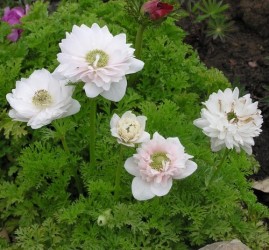 Verreweg de bekendste anemoon, geliefd door alle tijden heen als snijbloem en al vanaf ca. 1850 vanuit Frankrijk in ons land geïntroduceerd. Er zijn twee bekende typen: het De Caentype met grote, fraai gekleurde, enkelvoudige bloemen en het St. Brigidtype met halfgevulde bloemen en vrij smalle bloemblaadjes. Verlangen voedzame humeuze grond en met enig winterdek voldoende vorstbestendig. Hoogte 25 cm.