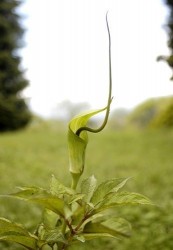 Dit is wel een van de hoogste Arisaema’s, op 1-1,5 m hoogte torenen de wit-groen-lila bloemen (meestal) boven het vingervormige blad uit. De bloeikolf (of knots) groeit uit tot een lange staart, die recht omhoog steekt. Geef ze zeer humeuze grond en plant ze gerust 10-20 cm diep voor een stevige groei. Na de bloei ontstaan in de herfst prachtig dikke trossen met rode bessen. Je vindt dit soort in het wild vooral in het Indisch subcontinent.