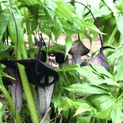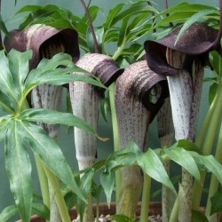Dit fraaie Japanse soort maakt grote bekers (vlak boven de grond) en ongeveer tegelijk ontvouwt zich het (niet minder fraaie) blad. De bekers hebben aan de binnenzijde een diep bruinrood dakje, het uitgroeisel van de bloemschede. De bruinrode bloeikolf groeit uit met een decimeters lange sliert, wellicht om insecten extra te lokken. De buitenkant van de bloemschede is gestreept wit met bruinrood... Zet de knollen op een schaduwplek in zeer humeuze grond, extra winterdek geeft een goede kans op overwintering, anders even oppotten en vorstvrij houden.