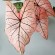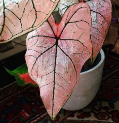 De grote pijlvormige bladeren zijn helderwit met groene nerven en groene omranding.