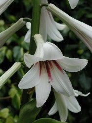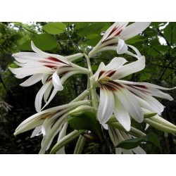 Een bijzondere en spectaculaire telg van de lelie-familie uit China en Japan. De plant laat voor de bloei een mooie, hosta- of aronskelkachtige plant zien. Een mooietoef frisgroen blad, niet direct als een lelie herkenbaar. Meestal hetzelfde jaar geeft de plant op 1,5-2,5 m hoogte een uitbarsting van iets naar beneden gerichte, grote trompetvormige bloem: wit met een prachtige wijnrode keel. Bescherm de plant goed ‘s winters of bewaar de bollen vorstvrij. Enkele uren zon per dag is de beste omstandigheid, te veel zon geeft bladverbranding. Plant de bollen ondiep, er mag een klein stukje bol zichtbaar zijn. Zorg dat de ondergrond veel humus bevat!