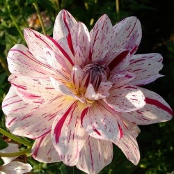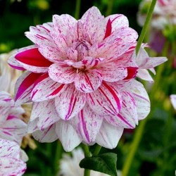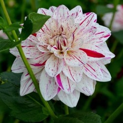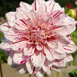 De koning van de zomerbloeiende knollen! De grote verscheidenheid aan kleur en vorm, de adembenemende volmaakte vorm en de goede houdbaarheid op de vaas maakt deze bloem zo populair! Een zgn. Decoratiefbloemig type, d.w.z. met brede lintbloemen. De extra brede lintbloemen combineert deze fantastisch mooie dahlia met een helderwitte kleur, die decoratief “beschilderd” is met dikke en dunne rode strepen. Hoogte 90 cm.