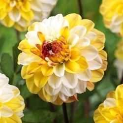 Een zgn. Decoratiefbloemig type, d.w.z. met brede lintbloemen. De vrij bolronde bloem heeft een speelse variatie van witte en warmgele lintbloemen, elke bloem is anders! Vanuit het centrum kleurt de bloem wijnrood... Een bloem die je gezien moet hebben!