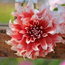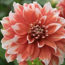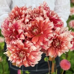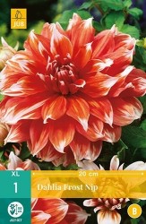 De koning van de zomerbloeiende knollen! De grote verscheidenheid aan kleur en vorm, de adembenemende volmaakte vorm en de goede houdbaarheid op de vaas maakt deze bloem zo populair! Een zgn. Decoratiefbloemig type, d.w.z. met brede lintbloemen. De zeer grote bloemen zijn donker zalmoranje gevlamd met witte uiteinden.