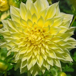 De koning van de zomerbloeiende knollen! De grote verscheidenheid aan kleur en vorm, de adembenemende volmaakte vorm en de goede houdbaarheid op de vaas maakt deze bloem zo populair! Een zgn. Decoratiefbloemig Type, d.w.z. met brede lintbloemen. Lichtgeel met extra grote, platte bloemvorm. Hoogte 90 cm.