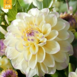 De koning van de zomerbloeiende knollen! De grote verscheidenheid aan kleur en vorm, de adembenemende volmaakte vorm en de goede houdbaarheid op de vaas maakt deze bloem zo populair! Een zgn. Decoratiefbloemig Type, d.w.z. met brede lintbloemen. Zeer lichtgeel naar wit uitlopend en een speels lila uiteinde. Middelgrote bloemen aan vrij compacte planten. Hoogte 50-70 cm.