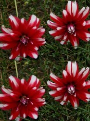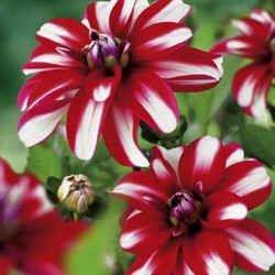 De koning van de zomerbloeiende knollen! De grote verscheidenheid aan kleur en vorm, de adembenemende volmaakte vorm en de goede houdbaarheid op de vaas maakt deze bloem zo populair! BIOLOGISCH GETEELD! Een zgn. Decoratiefbloemig Type, d.w.z. met brede lintbloemen. Elke rode lintbloem heeft aan het uiteinde een witte “lik”. De felle kleuren van een kapperspaal!