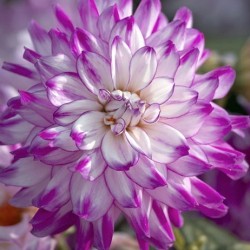 De koning van de zomerbloeiende knollen! De grote verscheidenheid aan kleur en vorm, de adembenemende volmaakte vorm en de goede houdbaarheid op de vaas maakt deze bloem zo populair! Een zgn. Decoratiefbloemig Type, d.w.z. met brede lintbloemen. Grote bloemen! Zilverwit met dieppaarse randen en punten. De kleurschakering geeft diepte aan de bloem! Hoogte 110 cm.