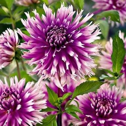 De koning van de zomerbloeiende knollen! De grote verscheidenheid aan kleur en vorm, de adembenemende volmaakte vorm en de goede houdbaarheid op de vaas maakt deze bloem zo populair! Dit Splitcactus Type heeft smalle, puntige lintbloemen, die aan de uiteinden zich splitsen, hierdoor ontstaat de suggestie van extra smal bloemblad. Dieppurper met witte punten. Hoogte 90 cm.