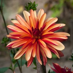 Dahliakenners herkennen in deze groep als nauw verwant met de oorspronkelijke soort: enkelbloemig met lange, dunne lintbloemen. Door de ijverige bloei een extra aanrader! Oranje met wijnrode strepen en diep wijnrood aan de achterzijde van de lintbloemen. Hoogte 70-90 cm.