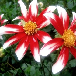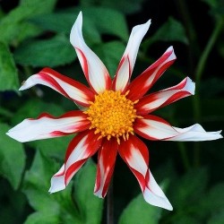 Stervormig, subtiel, zeldzaam fraai! Dahliakenners herkennen in deze groep als nauw verwant met de oorspronkelijke soort: enkelbloemig met lange, dunne lintbloemen, die speels naar binnen krullen. Door de ijverige bloei een extra aanrader! Spierwit met helderrode randen, vanuit het centrum soms wat meer rood. Hoogte 60-90 cm.
