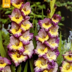 Grootbloemig type, we leveren een grote knolmaat die gegarandeerd stevige bloeistengels met veel bloemen geeft (mits op tijd geplant). Hoogte 100 cm. Citroengeel in het keeltje, uitlopend naar donker- en lichtviolet.