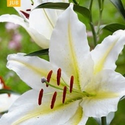 Oriental Lelie, 110 cm hoog. Grootbloemig, breed bloemblad en heerlijk geurend. De helderwitte bloemen hebben in het midden van elk bloemblad een citroengele streep vanuit het centrum tot het bladpuntje.