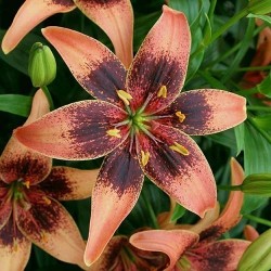 De lelie spreekt al eeuwen tot de verbeelding van de mensheid: in de bijbel als symbool van de schoonheid, in de Middeleeuwen als symbool van maagdelijke reinheid. De bloem geeft op een halfschaduwplaats in uw tuin een effect van verstilde schoonheid .… Aziatische Lelie, 90 cm hoog; lichtzalm aan de uiteinden met zwartpurperen spikkels in het centrum.