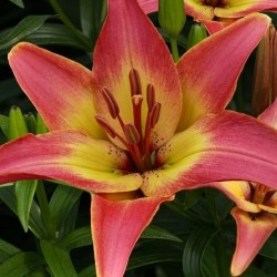 De lelie spreekt al eeuwen tot de verbeelding van de mensheid: in de bijbel als symbool van de schoonheid, in de Middeleeuwen als symbool van maagdelijke reinheid. De bloem geeft op een halfschaduwplaats in uw tuin een effect van verstilde schoonheid .… Aziatische Lelie, 100 cm. Fris en warm van kleur: het warmgeel in het centrum vloeit geleidelijk over in dieproze.