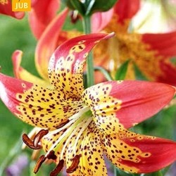 De lelie spreekt al eeuwen tot de verbeelding van de mensheid: in de bijbel als symbool van de schoonheid, in de Middeleeuwen als symbool van maagdelijke reinheid. De bloem geeft op een halfschaduwplaats in uw tuin een effect van verstilde schoonheid .… Deze prachtige tijgerlelie is vanuit het hart citroengeel met fraaie kastanjebruine stippels en naar de punten van het bloemblad kleurt de bloem oranjerood tot rozerood. Hoogte 100 cm.