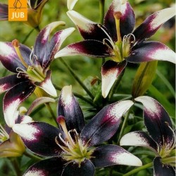 De lelie spreekt al eeuwen tot de verbeelding van de mensheid: in de bijbel als symbool van de schoonheid, in de Middeleeuwen als symbool van maagdelijke reinheid. De bloem geeft op een halfschaduwplaats in uw tuin een effect van verstilde schoonheid .… Aziatische Lelie, 60 cm hoog met aan elke bloemstengel een tros bloemen met vrij slank, spits bloemblad. Bruinzwarte kleur met witte uiteinden, zeer ongewoon!