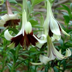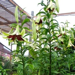 Deze bijzondere lelie betovert door zijn schoonheid! Op een hoogte van 40-150 cm bloeien de grote hangende kelken met groenwitte bloemen, naar het centrum gaat de kleur over in donker(bruin)purper.
