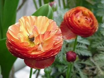 De knolletjes zijn net klauwtjes en geven van juni-aug de populaire ronde bloemen, die pioenbloemig gevuld zijn. Oranje