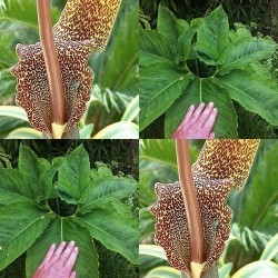 Deze Voodoolelie is een enorme opvaller in je tuin! De knol kan ook droog bloeien in het voorjaar: er komt een enorme bloemschede met een even zo lange bloeikolf uit de knol. De bloemen worden groter naarmate de knol groeit. De kleur is crème met bruinrode spikkels en omdat dit een aasbloem is (die vliegen nodig heeft voor de bestuiving) komt er een zoet weeïge lucht van de bloemen af, geen goed idee om ze binnen te zetten tijdens de bloei, of juist wel als grap...