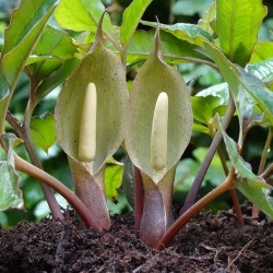Dit zeldzame soortje groeit in het gebergte van China ten noordoosten van Yunnan. Op 3360-4000 meter hoogte in het natte grasland vind je deze unicum! Tegelijk met het pijlvormige blad komen de bloemscheden uit de grond. Het blad heeft een mooie donkere stengel is donkergroen met paarse gloed in een waaiervorm, hoogte ongeveer 25 cm. De bloemschede is lichtbruin gevlekt en vormt gemakkelijk zaad, zodat de plant zich goed settelt in de tuin. Uiteraard zijn de planten geheel winterhard en komen vrij laat (in mei) boven de grond.