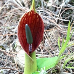 Dit zeldzame soortje groeit in het gebergte van Himachal Pradesh (Noord-India) en zuidelijk Tibet. Op 2500-4300 meter hoogte in het natte grasland vind je deze unicum! Tegelijk met het ovaal- tot pijlvormige, groene blad komen de bloemscheden uit de grond. De bloemschede is opvallend dieprood tot kastanjebruin van binnen met een zwartgrijze bloeikolf. De bloem vormt gemakkelijk zaad, zodat de plant zich goed settelt in de tuin. Uiteraard zijn de planten geheel winterhard en komen vrij laat (in mei) boven de grond