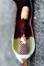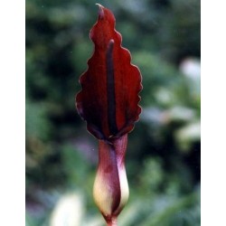 Een zeldzamere aronskelk uit China met een grote bruinpaarse bloemschede op lichtere basis en een dikke, rozerode bloeikolf. De pijlvormige bladeren worden ca. 50 cm hoog en verschijnen laat in het voorjaar. De bloei is gelijktijdig met het verschijnen van het blad. Geef de plant een halfbeschaduwd plekje. De knollen zijn behoorlijk winterhard, je mag ze rooien en vorstvrij overwinteren.