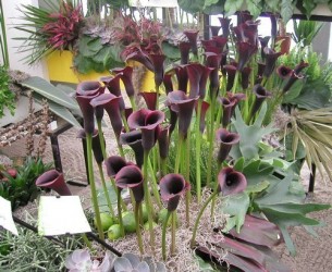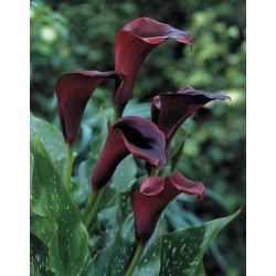 Zeer exclusieve, purperzwarte variƫteit met kokervormige bloemen aan 80 cm lange, dikke stengels. Decoratief gespikkeld, pijlvormig blad.