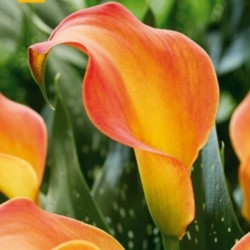 Het gespikkelde, pijlvormige blad vormt een sierlijke basis voor de kokervormige bloemen. Deze zijn fantastisch oranjezalm van kleur. Hoogte 60 cm.