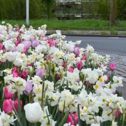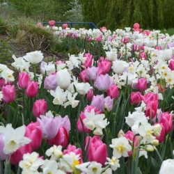 Deze frisse kleurenpracht bevat een overweldigende combinatie van wit, roze en lila. Dit mengsel van zowel Tulpen als Narcissen vormt een opvallende verschijning in parken, rotondes en nu dus ook in jouw tuin! Hoogte 40-55 cm, bloeitijd april-mei, 100 bollen is voldoende voor 1-2 m² (als je geen grond meer wilt zien).