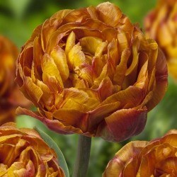 Middenhoge tulp met dubbele bloemen (meerdere rijen bloembladen). Lange bloei! EXCLUSIEVE TULP! Een spannende kleur tussen koperbruin en mat oranje.