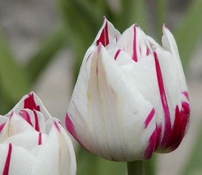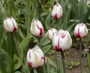 Een type tussen laag en hoog in. Behoorlijk stevig, ideaal als hogere borderbloem en natuurlijk ook als snijbloem. Bijzondere kleuren: wit met van onderen af scherpe, slanke, rode aders.