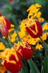 Ouderwetse "bewerkte" tulpen zijn weer helemaal in en exclusief! Een bijzonder speels effect: de bloemen zijn langs de randen gekarteld en iets lichter getint. Felrood met gele franjerand