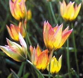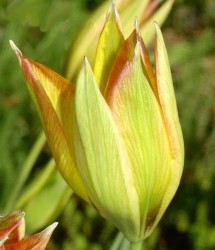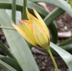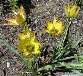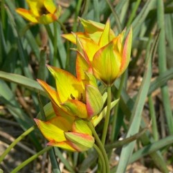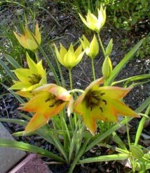 Oorspronkelijk "wilde" soorten (ook wel Tulipa species genoemd), vaak blijvertjes in de tuin, kleinere bloemen. Een rank tulpje, geel van binnen en oranje met groen aan de buitenkant. Een spontane mutant uit de T. syvestris.