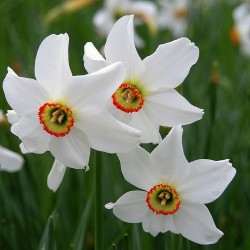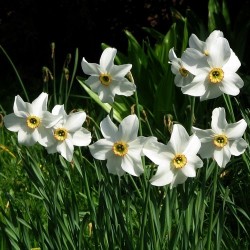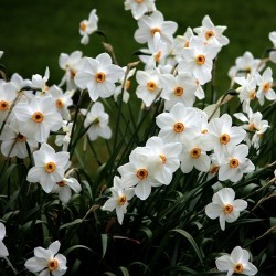 poeticus soort: bijna platte trompetjes, ze verspreiden een heerlijke geur. Eén bloem per stengel. BIJZONDER! Dit ras houdt van halfschaduw en veel humus. Het 2e jaar verschijnen de spierwitte bloemen met kleine groengele trompetjes, die roodomrand zijn (oogjes). De krachtige, nootmuskaatgeur bezorgde deze narcis de bijnaam Nootmuskaatnarcis!