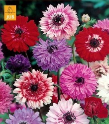 Verreweg de bekendste Anemoon, geliefd als snijbloem en al in 1850 vanuit Frankrijk in ons land geïntroduceerd. Er zijn twee bekende typen: het De Caen-type met grote, fraai gekleurde, enkelvoudige bloemen en het St.Brigid-type met halfgevulde bloemen en vrij smalle bloemblaadjes. Verlangen voedzame humeuze grond en met enig winterdek is de plant voldoende vorstbestendig. Voor het planten de knolletjes een nachtje in water weken. Vrolijk mengsel van witte, rode, roze, lila en blauwe tinten. Dubbelbloemig met zichtbare bloemharten.