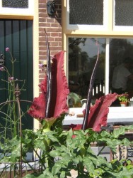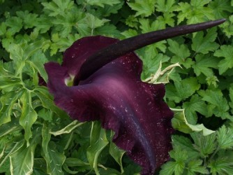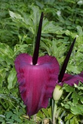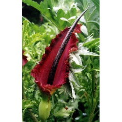 Stel je voor: het fraai gedeelde blad groeit op tot een hoogte van 80-100 cm, daarboven begint de bloeiwijze: een bloeischede van wel 40 cm lang in een fluwelige diep bruinpaarse kleur. Plant ze 15 cm diep en geef ze een winterlaagje. We leveren grote knollen voor een jaarlijks succes! Het eerste jaar moet de bol zich settelen, geef ze vruchtbare grond, maar niet te nat.