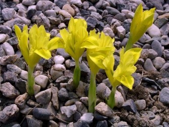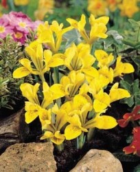 Een kort ( 10 cm hoog) rotstuin-irisje met pittig gele bloem (middenin groen gevlekt). Plant ze 10 cm diep, om ze langer te kunnen houden.