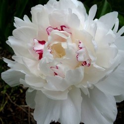 (1851) Het is altijd een feest als vanaf begin juni dit mooie ras zijn bloemen ontvouwt! De lichtroze, volledig dubbele bloemen verbloeien naar wit en hebben contrastrijke, rode vlekjes en randjes in de bloem. De bloemen staan stevig rechtop (hoogte 100cm) en geuren heel aangenaam!