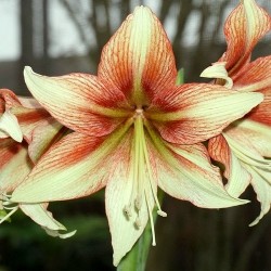REUSACHTIGE BOLLEN! Deze grootbloemige Amaryllis heeft de grootste bolmaat die we kunnen krijgen en geeft gegarandeerd 3-4 bloeistengels met elk 4-6 bloemen. Slank bloemblad met lichtgroen tot creme als grondkleur en subtiele, rode strepen vanuit het centrum als dieptedecoratie!