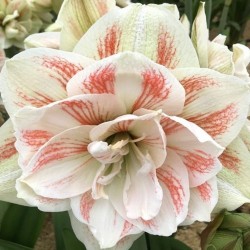 DUBBELBLOEMIG. Verbazing alom, de midden-grootbloemige Amaryllis met een dubbele hoeveelheid bloembladen per bloem: nog kleuriger, nog exotischer...! Waar wij “verbazingwekkend” zeggen heeft de Engelsman een krachtiger woord: “stunning”. Dit kwam in mij op, toe ik deze prachtige dubbelbloemige Amaryllis zag: helderwit met subtiele rozerode streepjes…