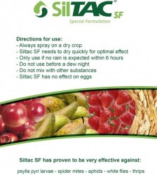 Dit nieuwe groene middel (Koolwaterstof met Silicium) is niet schadelijk voor het milieu en laat geen residu achter. Ontworpen voor de bestrijding van talrijke plagen zoals: spintmijten, trips, alle soorten luizen, witte vlieg en bladvlooien. Het middel legt een film over de plaaginsecten die binnen enkele seconden doodgaan. Door dit werkingsmechanisme kan er geen resistentie opgebouwd worden. Siltac SF wordt aanbevolen voor gebruik in hard- en zachtfruit, (kas)groenten, siergewassen en granen.