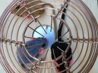 Een slim gevormd muizenvalletje met trechtervormige openingen van boven en aan de zijkant, de muis kan er in, maar niet meer er uit. Na het vangen snel de muisjes elders bevrijden door het bodemluikje open te schuiven.