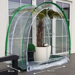 Deze handige tent heeft veel mogelijkheden: vervroegen en afharden in het voorjaar, tropisch verwennen in de zomer, groei verlengen in de herfst en beschermen in de winter. De tent heeft als afmeting 186 cm breed, 175 cm hoog en 84 cm diep. Met een stevige rits om te kunnen “luchten” of extra goed af te sluiten.