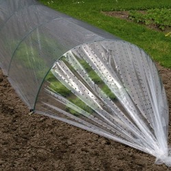 Deze transparante folie is elke 5 cm voorzien van gaatjes (1 cm doorsnee), dat voorkomt een overmaat aan vocht (condens) dat weer terugvalt op de plant. Hierdoor kan de folie (gedurende korte tijd) rechtstreeks over een planten- of zaaibed worden gelegd, het gewicht is maar 20 g p/m². Wel de randen verzwaren met stenen of aarde om opwaaien te voorkomen. Uiteraard is dit ook ideale folie om een tunneltje mee te maken. Afmeting 1,5 x 10 m.