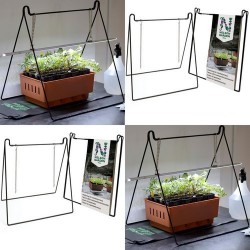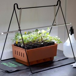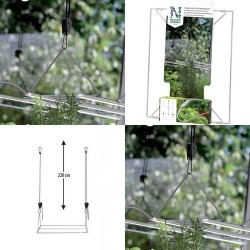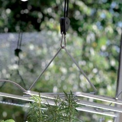- Frame met lift. Het frame hang je aan schroefogen (niet meegeleverd) met 2 zwarte koorden (van polypropyleen) van 220 cm lengte. Aan de koorden zijn hijsmechanismen bevestigd waardoor je heel gemakkelijk het frame hoger en lager kan hangen. Aan dit frame kunnen 1, 2 of 3 Verlichtingsstrips worden bevestigd. Ideaal om de afstand te vergroten als de planten groeien of als het licht wat steviger of milder mag.