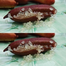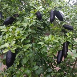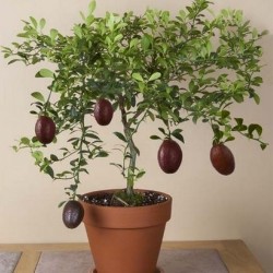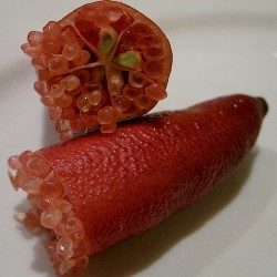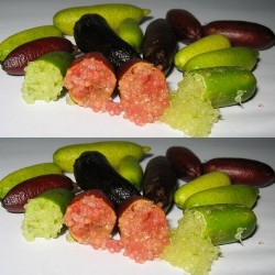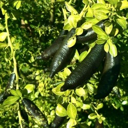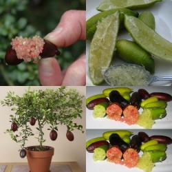 Deze tropische, Australische citrusvrucht geeft zeer unieke vruchten! Ze zijn vingervormig (soms eivormig), 8-10 cm lang en 2-5 cm in doorsnee. Open de vruchten en het vruchtvlees komt als bolletjes naar buiten. De combinatie van mondgevoel (net als kaviaar!) en heerlijk frisaromatische limoensmaak zal je nooit vergeten! De planten die we leveren hebben kleiner blad dan de meeste Citrussoorten en houden van een warme overwintering. De roze bloei en het blad geuren heerlijk. Onze planten leveren roze, groene, witte of gele vruchtbolletjes, per plant verschillend.
