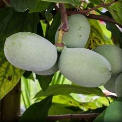 Gelukkig wordt deze, bij ons tamelijk winterharde fruitboom uit Noord-Amerika en Canada steeds bekender en populairder. De smaak van de langwerpige, geelgroene vruchten is echt exotisch en gaat richting banaan, mango en ananas en zit vol vitamines. Zo gezond, dat er serieuze aanwijzingen zijn op de voorkoming van kanker.  Jonge planten staan graag schaduwrijk en worden ‘s winters wat extra beschermd, later is volle zon ook prima en kunnen ze wel een pittig wintertje hebben. Hoogte uiteindelijk 2-5 m, snoeien is aan te bevelen om nog hogere groei te voorkomen! De opbouw van de boom is iets hoger dan breed, dus op den duur is een boomspiegel van 3-4 meter aan te bevelen. Houd tussen 2 bomen minimaal 4 m afstand. Na ongeveer 4 jaar zijn de eerste vruchten te verwachten, voorafgegaan in de lente door vreemd geurende, witte naar roodbruin verkleurende bloemen. Zeewind waarderen ze niet, iets zure grond (op kleigrond zorgen voor veel humus) en een mulchlaagje waarderen de bomen echter zeer. Van ziekteaantastingen is in ons klimaat nog niets bekend, maar er is nog niet veel ervaring.